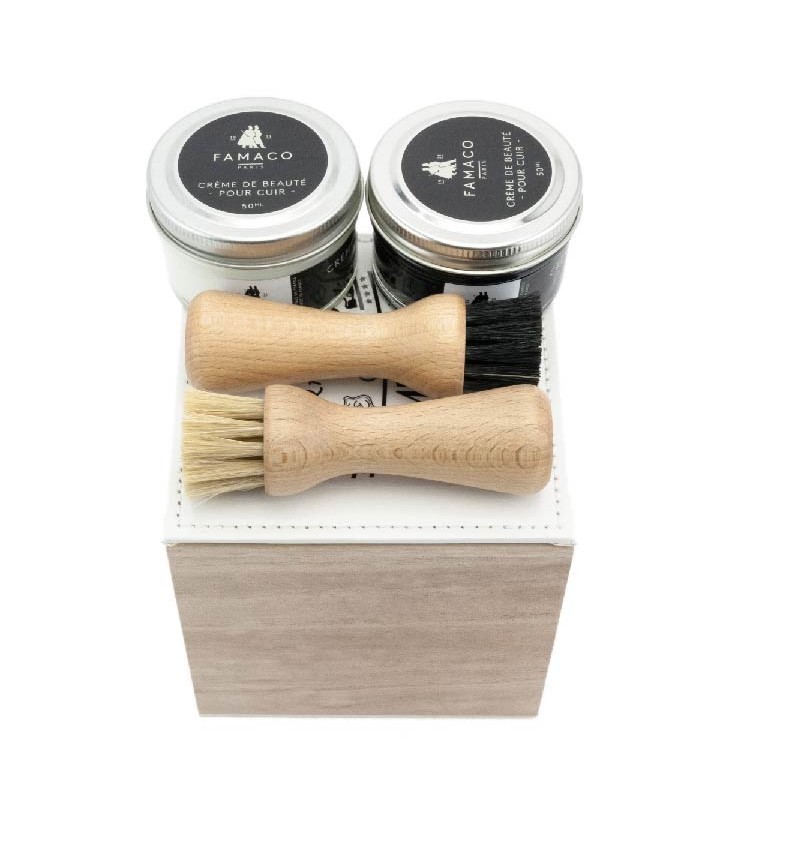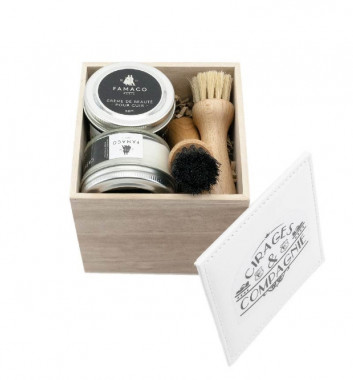 Ce coffret unique en bois de paulownia, fera un cadeau idéal pour noël ou pour un anniversaire. Ce coffre contient deux crèmes de beauté de la marque Famaco ainsi que deux accessoires pour appliquer ce cirage en toute simplicité. D'un taille suffisamment grande pour accueillir de deux à trois cirages, vous pourrez l'utiliser pour ranger votre petit kit d'entretien du cuir sans difficulté. Son couvercle en simili cuir blanc, protégera vos produits de la poussière et de la lumière extérieure.